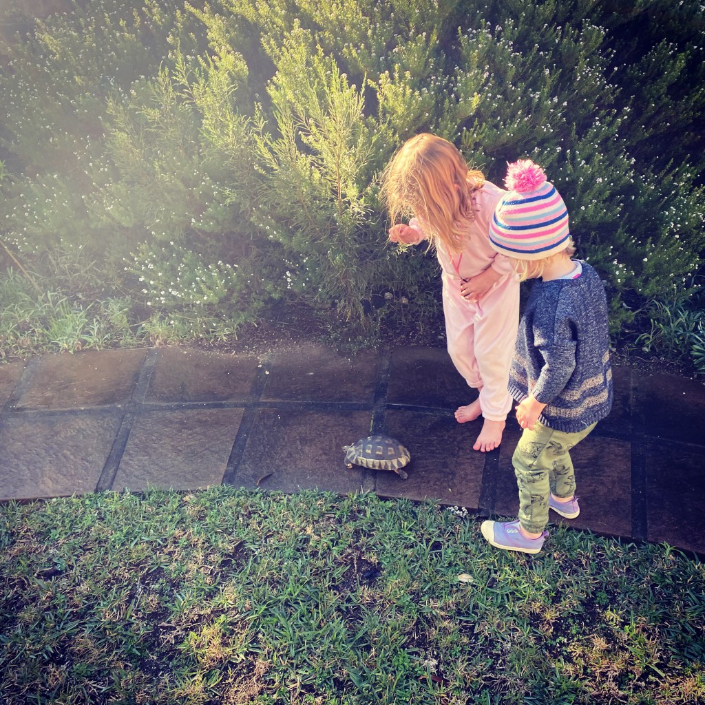 The girls have adapted remarkably well. Their new school is good and they’ve been getting to grips with the new fauna. This Angulate Tortoise is in our back garden. These along with the Guinea Fowl, Franklins, Bell frogs and Mongooses (I desperately want to write Mongeese to pluralize them) are likely the most ubiquitous creatures around the house.