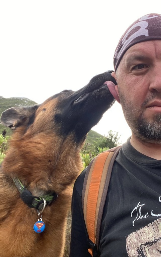 We’re trying a new route up the mountain. The ‘trailhead’ starts about a mile from my front-door. Contractors from the municipality have recently cut back some of the alien vegetation here but have left (what I can only imagine are) most of the branches behind, which have formed this springy weave, full of voids and snags. So the first half-a-kay is actually a gingery-shuffle across no-mans land.